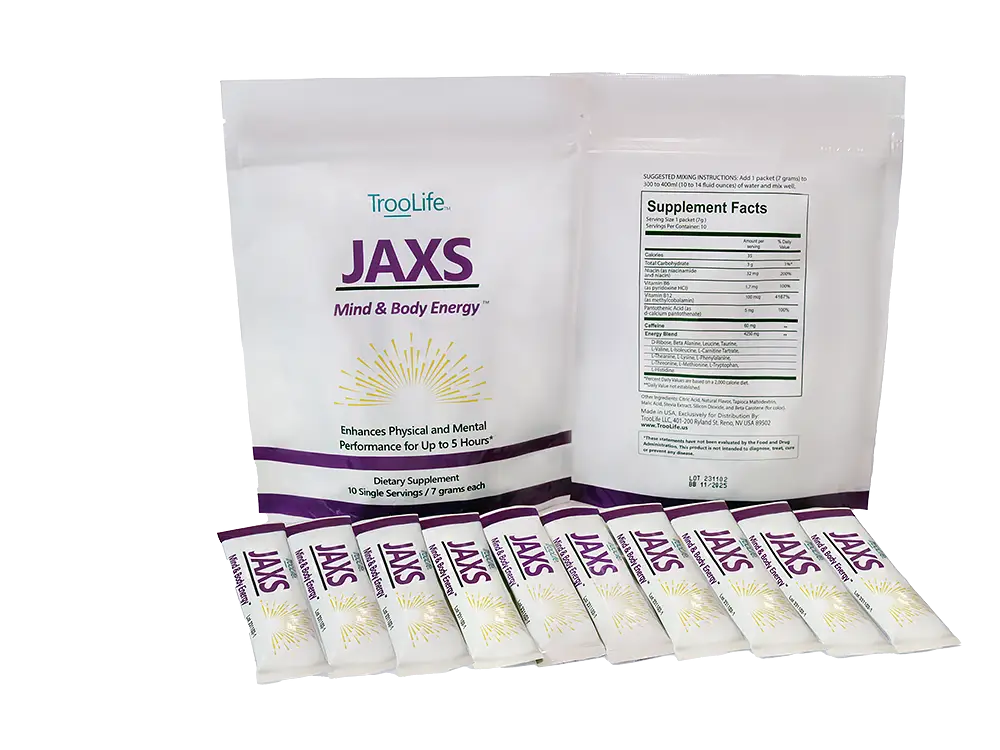 我们的JAXS 身心能量饮将帮助人体增强身体机能和集中精神,效能长达五小时!多数时候,人体需要补充能量来让身体和精神达到最佳状态,不过应注意避免饮用含有植物兴奋剂和过量糖分的能量饮料,因为它们只会给你带来短暂的能量提升,随后而来的便是身体感到能量失衡。 在进行体力活动或锻炼前约15分钟,或在高强度脑力活动和重要会议之前,将一包JAXS身心能量饮溶入300-400毫升水中摇匀饮用,以帮助你持续数小时都能发挥最佳状态! JAXS是TrooLife独家专售、美国制造的高品质天然成分能量饮。含有14种经实验证明具有极大功效的氨基酸、维生素B6、维生素B12、烟酸和泛酸以及咖啡因,使得JAXS身心能量饮的吸收能力与效果更加提升!清新的柠檬莱姆风味,不含糖,热量仅有35卡路里。
